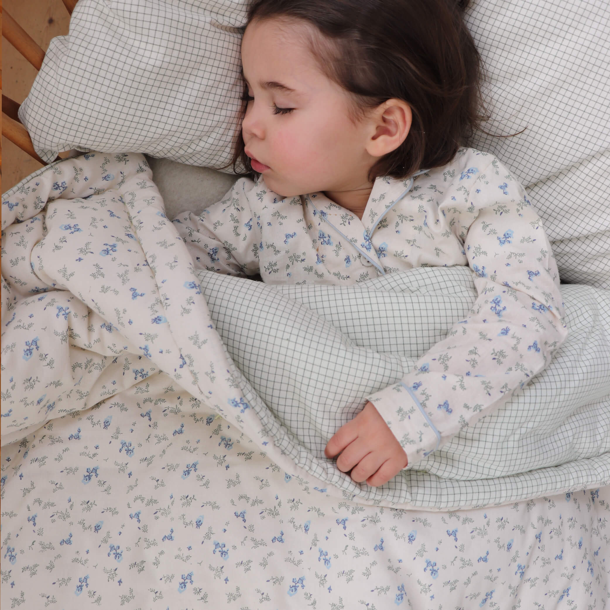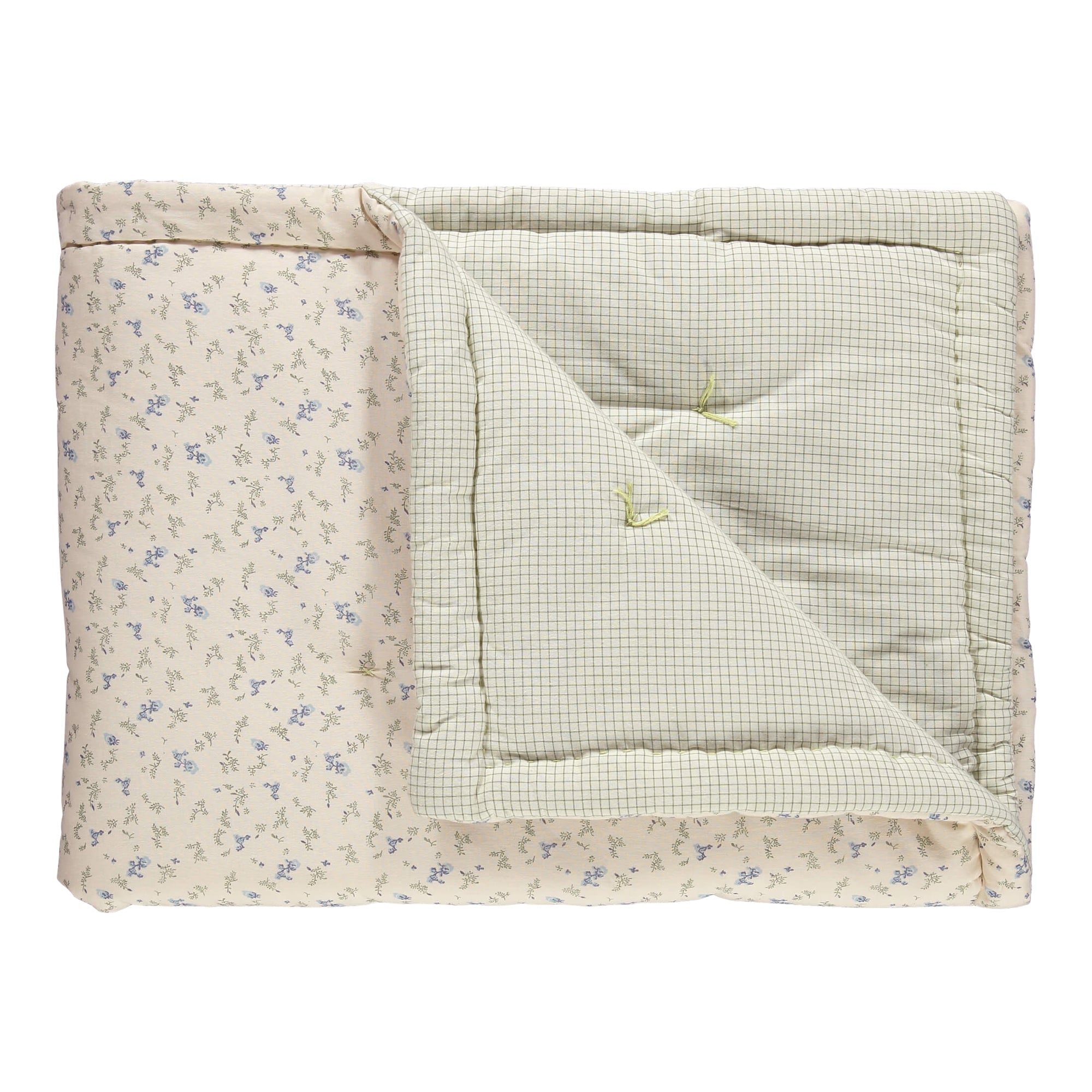 This very soft blanket has a soft wadded filling with hand stitched running line along the edge and cross stitches delicately sewn by artisans The front face is in a delicate vintage rose floral pattern that looks stunning in most nurseries. and reverse in green check. Perfect for extra warmth for your baby and can also be used as a play blanket. Comes in a storage bag.