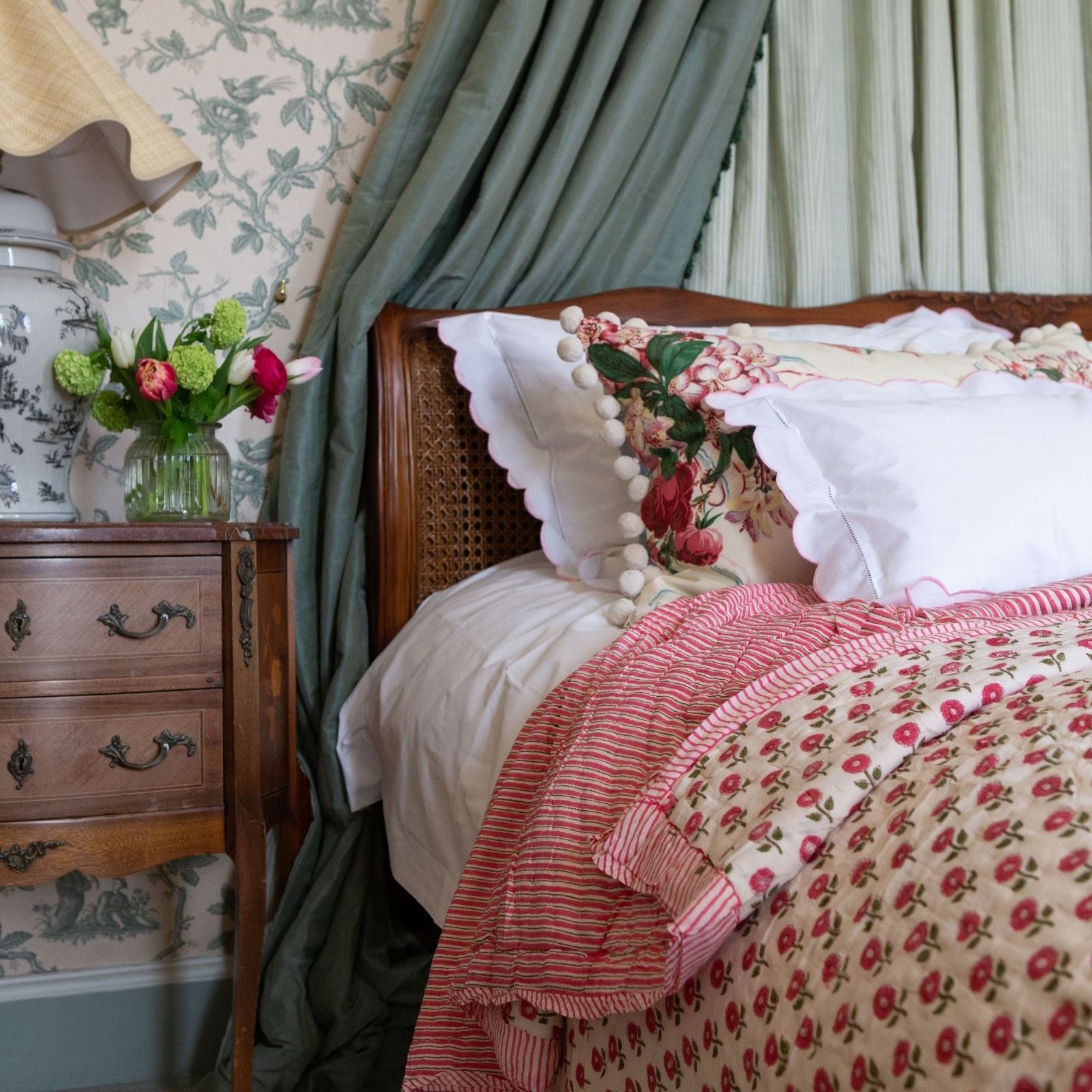 Beautiful quilts block printed with a pretty pink and green daisy design, featuring a striped border and stripes on the reverse. As seen in Brides Magazine.