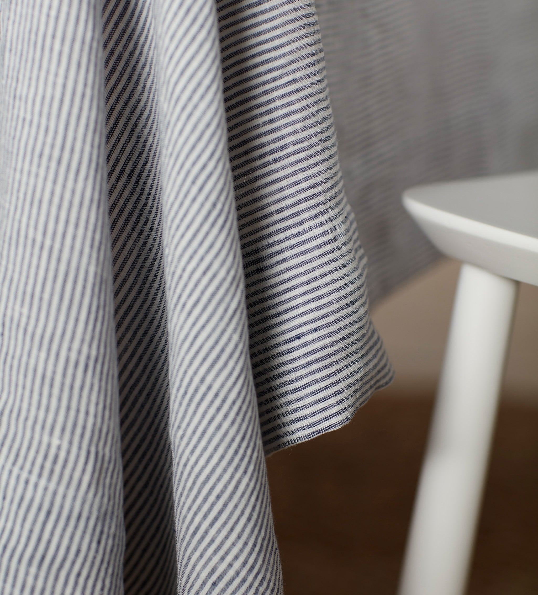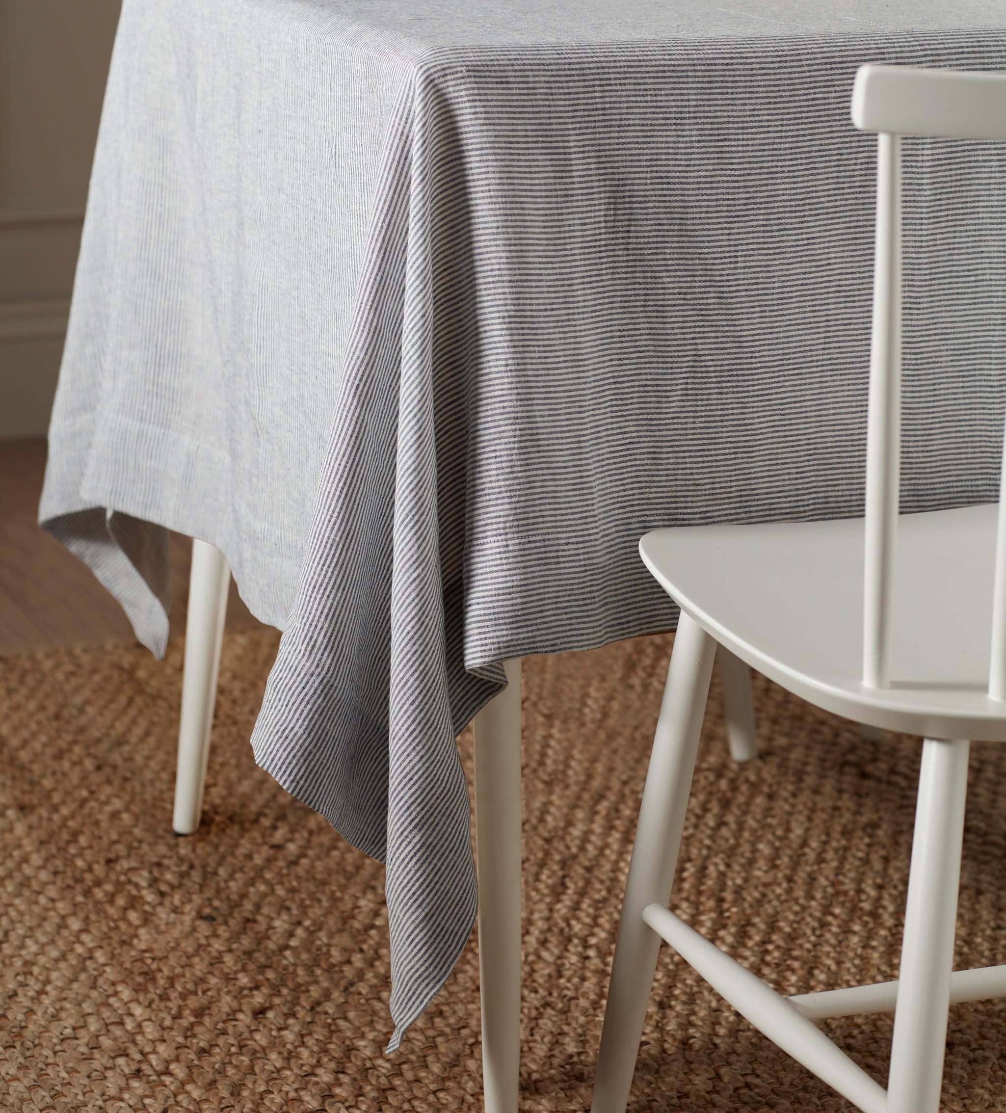 Create a table of dinnertime dreams with our delightful French blue striped tablecloth. Woven in Portugal from French blue and off-white 100% linen yarns, with simple mitred corners, this tablecloth has a beautiful relaxed texture and heavenly drape.