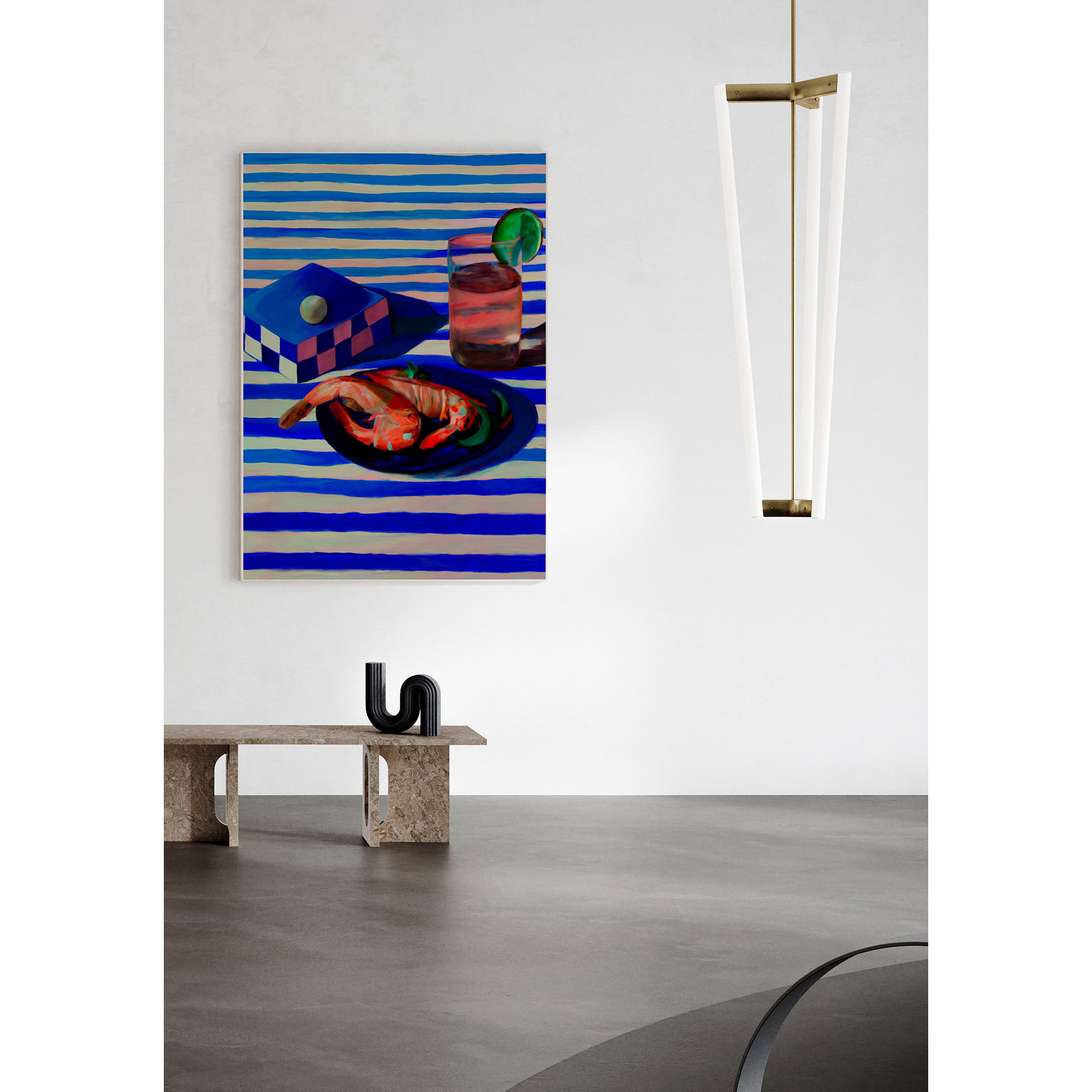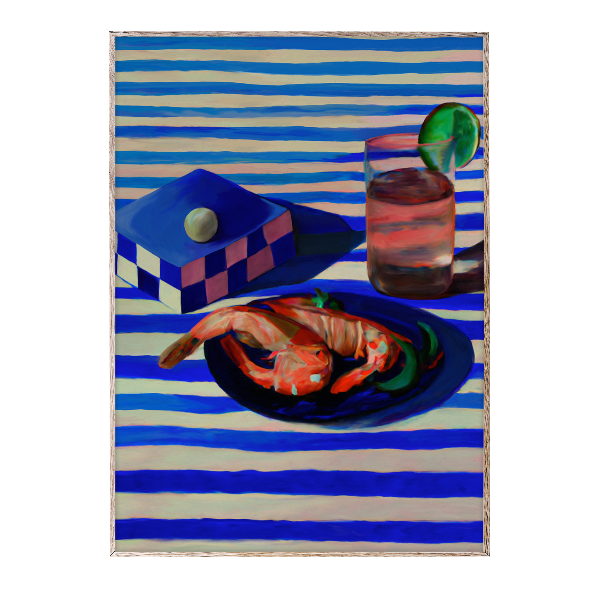 Shrimp & Stripes is a dinner table scene and painting from Misfitting Things. Welcome to a world of beauty and silence. Combining great art with high-end acoustic absorption the acoustic panels of the Imagine collection offer a unique opportunity to transform any space into an oasis of tranquillity while inspiring emotions. The collection boasts a diverse range of sizes ensuring a perfect fit for any room. Every artwork is framed in exquisite oak, showcasing the natural beauty of the material while adding a touch of sophistication to the overall composition.