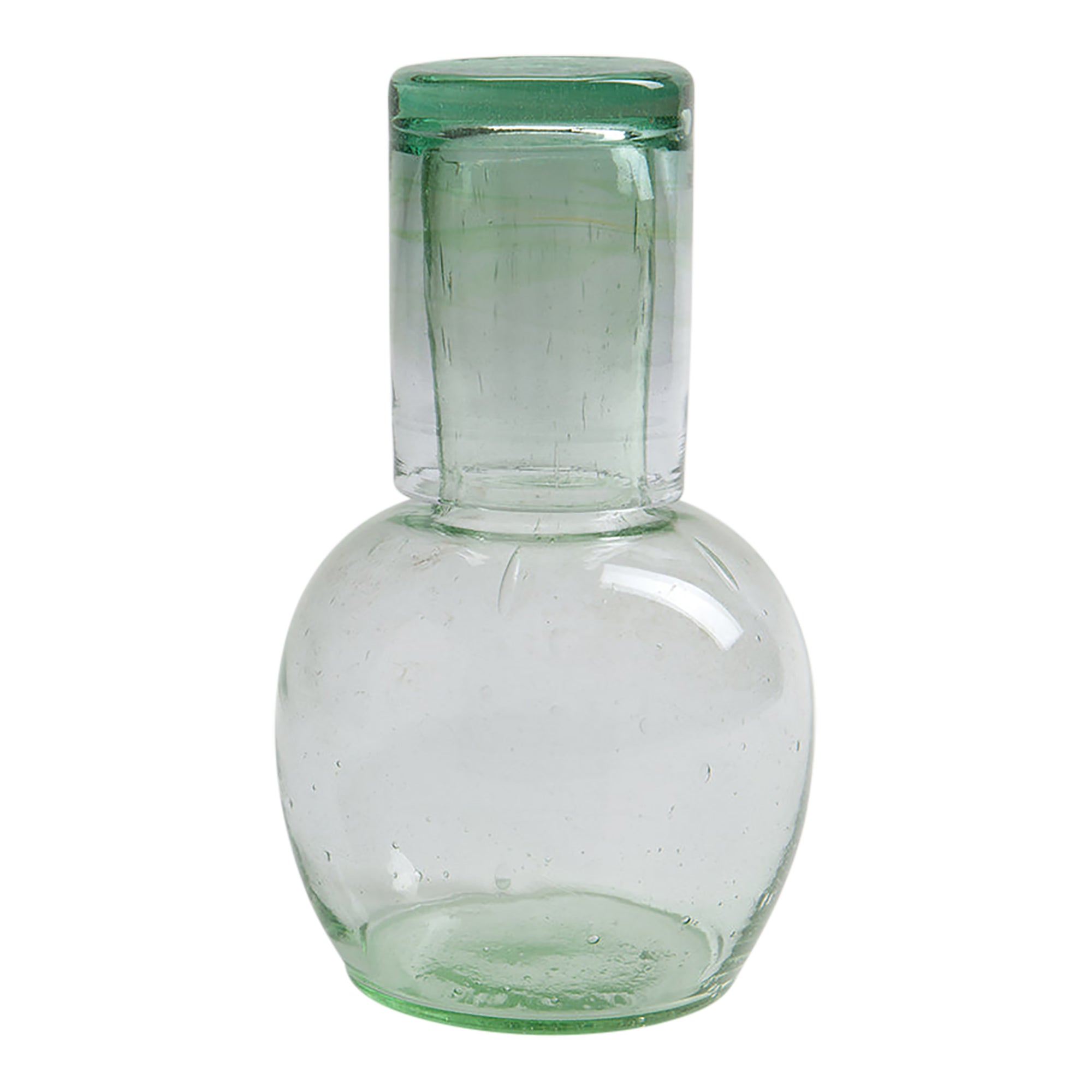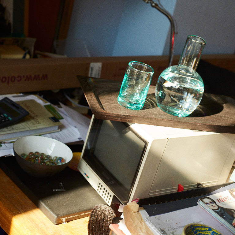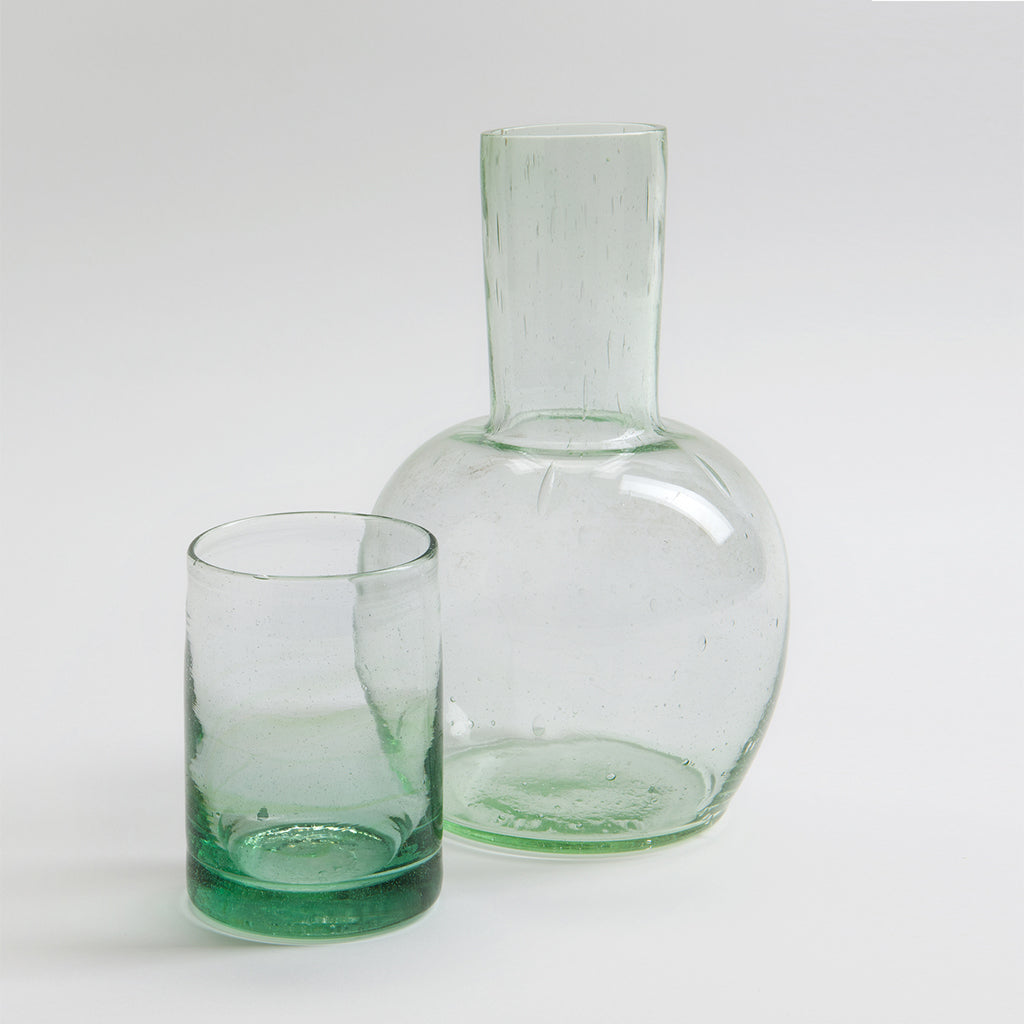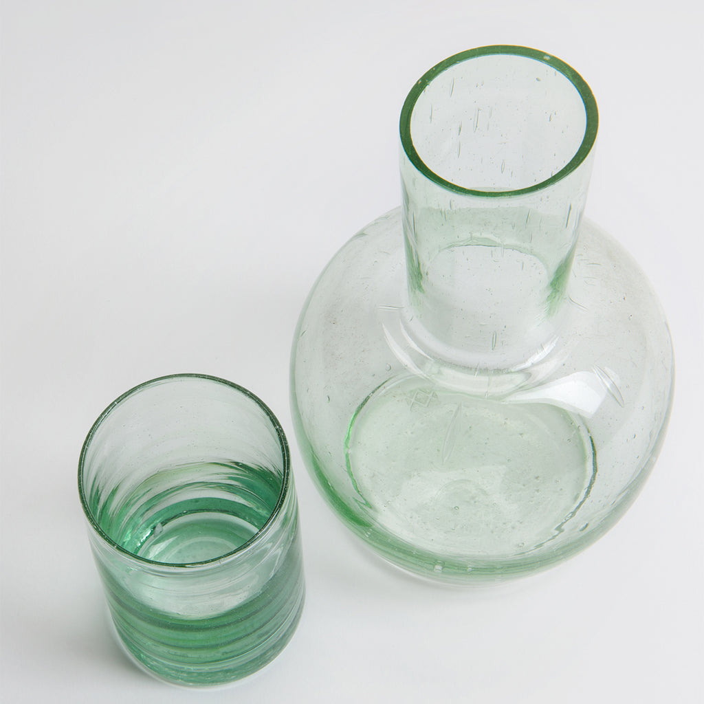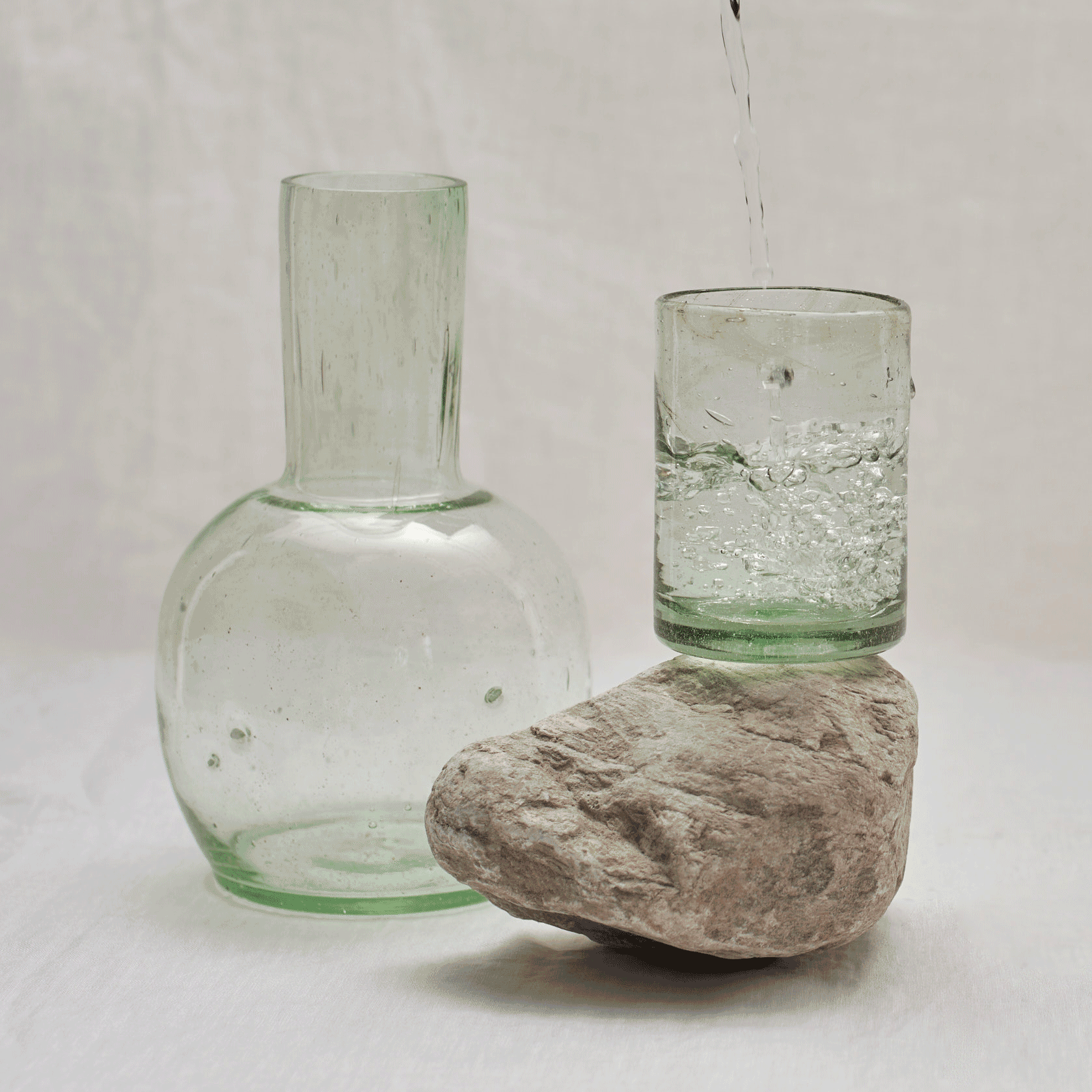 A beautiful, handblown carafe and glass, ideal for bedrooms and guest rooms. Just like the rest of our, this has been made from recycled bottles in a workshop north of Yangon. Each piece has ripples and bubbles making it different from the next. The natural turquoise colour is soothing and calming. A lovely little treat for your guests.